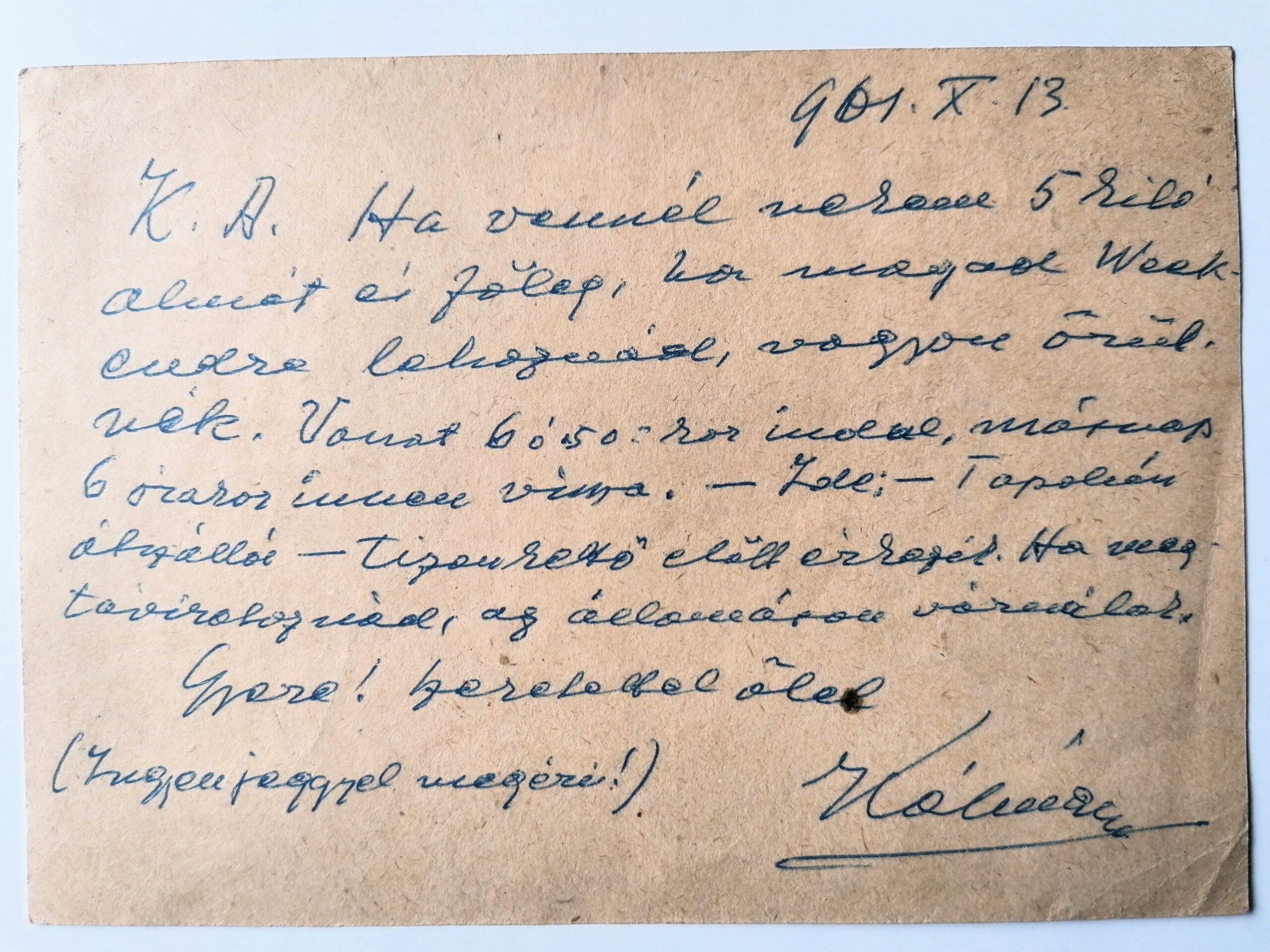 My father was also friends with Kálmán Csathó (1881–1964, writer, theater director, corresponding member of the Hungarian Academy of Sciences), whom we visited several times at his home in Hűvösvölgy. On one occasion, Csathó Kálmán was staying in Balatonederics and wrote a short letter to my father on October 13, 1961, asking him to visit for the weekend and to bring 5 kilograms of apples, which would make him very happy. He added: “Come! Warm hugs, Kálmán (It’s worth it with a free ticket).”