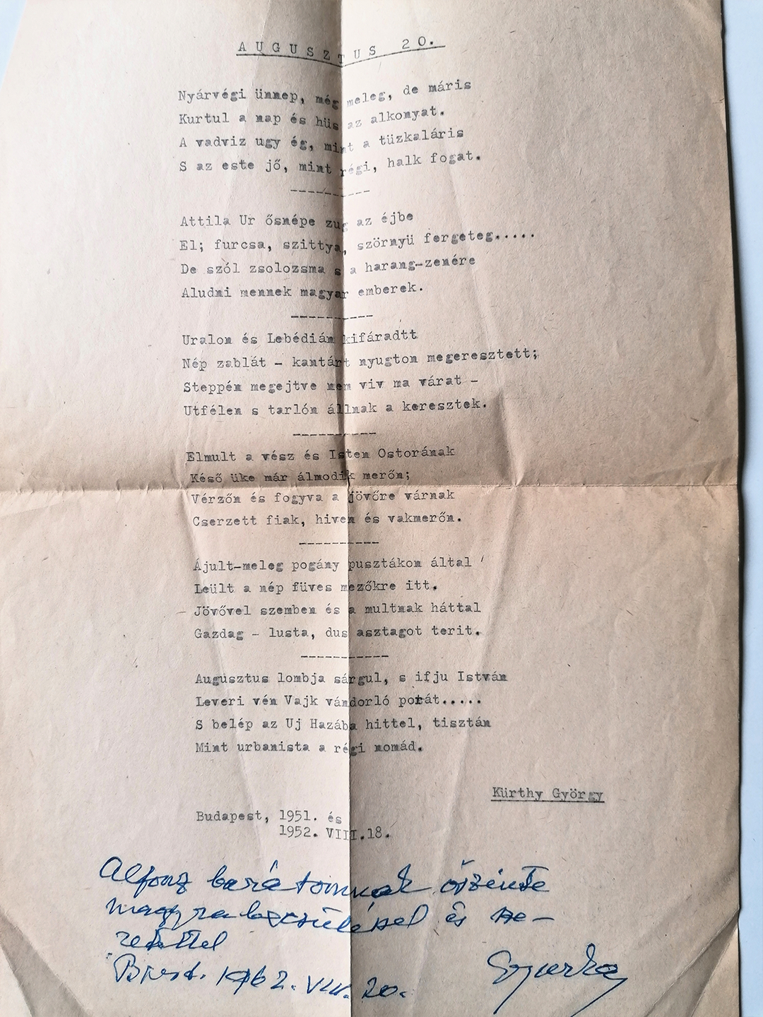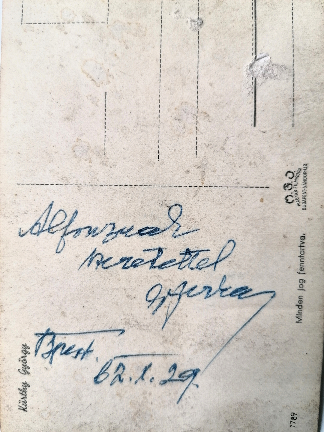 My father was also friends with György Kürthy (1882–1972), an actor, set designer, and writer, whose photograph, a cover letter, and a poem can be seen in the following images.